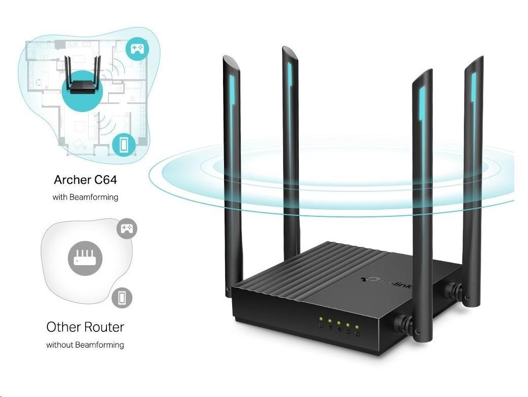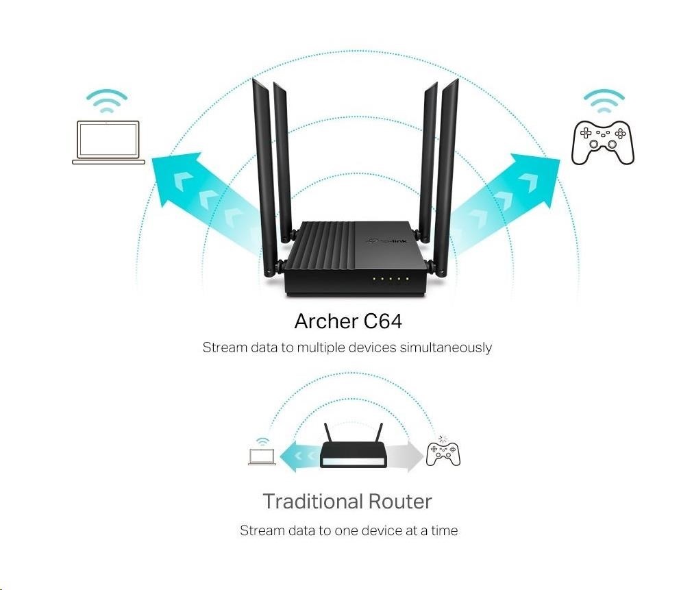 - Router Archer C64 umožňuje připojit více zařízení najednou a souběžně přenášet data díky podpoře dvou pásem 2,4 GHz a 5 GHz. Pásmo 2,4 GHz poskytuje spolehlivé připojení pro odesílání e-mailů, prohlížení webových stránek a další jednoduchou aktivitu. Pásmo 5 GHz nabízí rychlost až 867 Mb/s, která je vhodná pro činnosti náročné na přenos dat, jako je například streamování videa a hraní her on-line.† Díky připojení bez prodlev či zadrhávání už nikdy o nic nepřijdete.