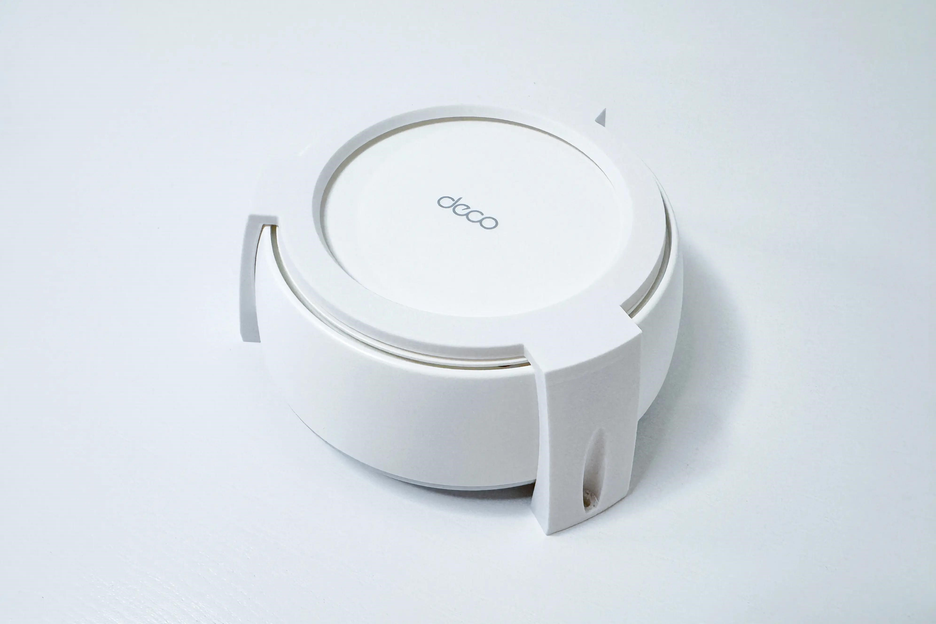 Plastový držák na stěnu a strop pro TP-Link DECO BE25 . Držák je vyroben z PETG materiálu na 3D tiskárně a má bílou barvu.
