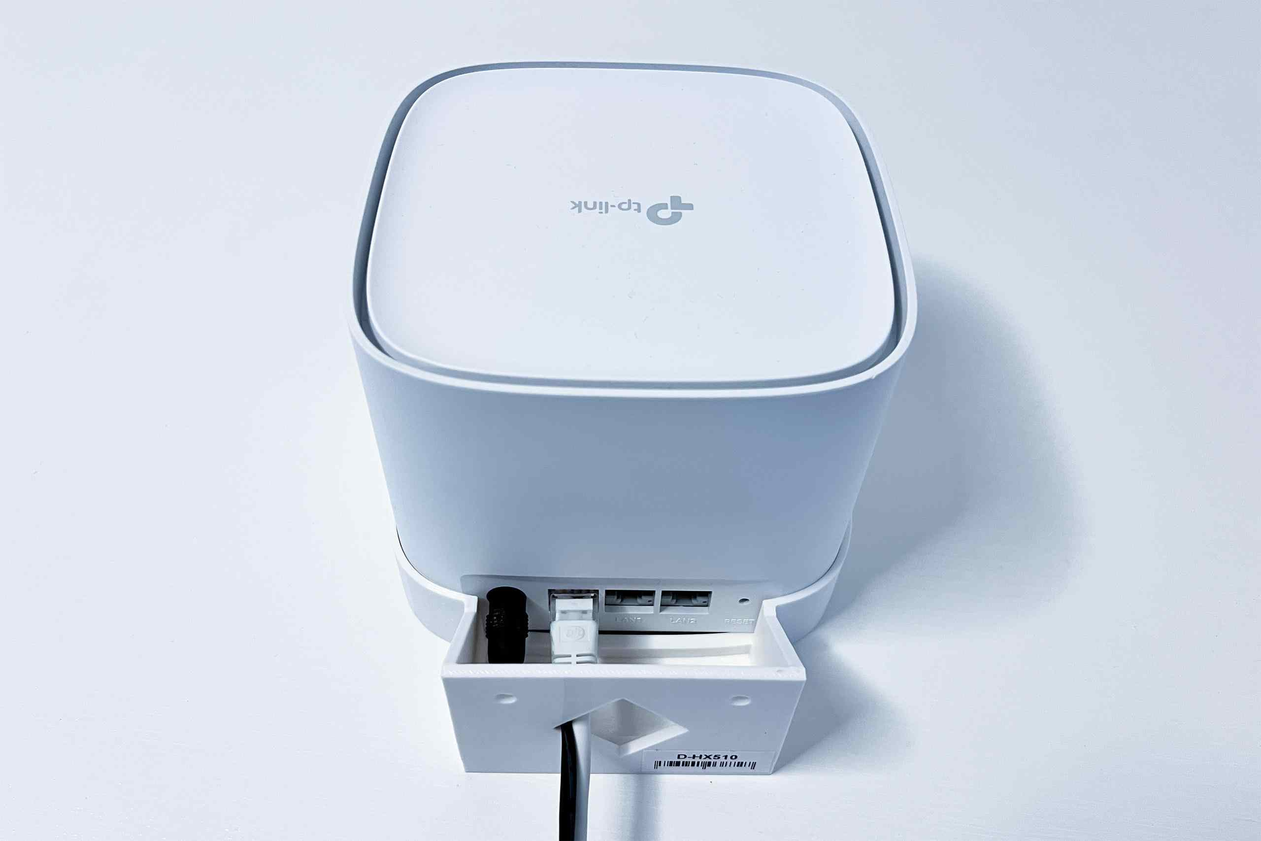 Plastový držák na stěnu pro TP-Link DHX510, HX520 na stěnu a to pomocí dvou šroubů. Držák je vyroben z PETG materiálu na 3D tiskárně a má bílou barvu.
