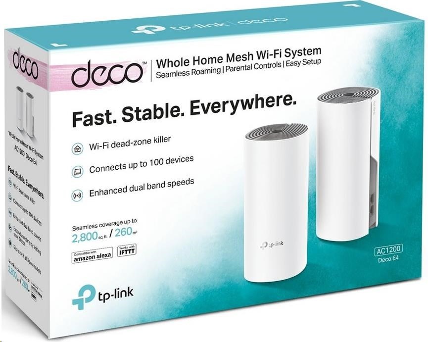 - Dvojbalení Deco E4 poskytuje Wi-Fi pokrytí na ploše až 2800 čtverečních stop (= 260 m2, verze EU). A pokud to nestačí, kdykoli k síti jednoduše přidejte další jednotku Deco, abyste zvýšili pokrytí.