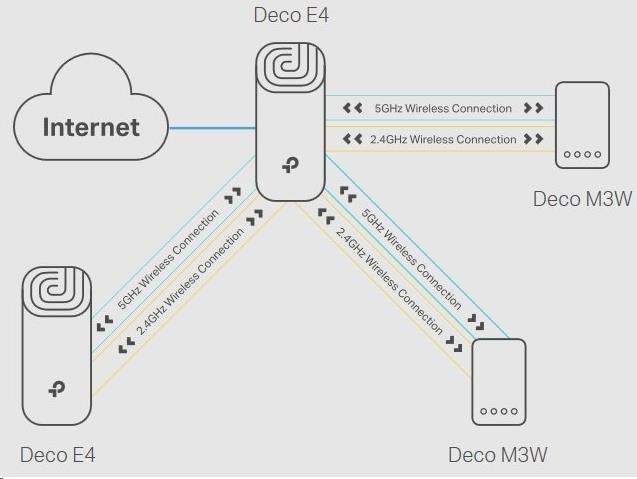 - Deco E4 poskytuje rychlé a stabilní spojení rychlostí až 867 Mb/s a spolupracuje s hlavními poskytovateli internetových služeb (ISP) a modemem.