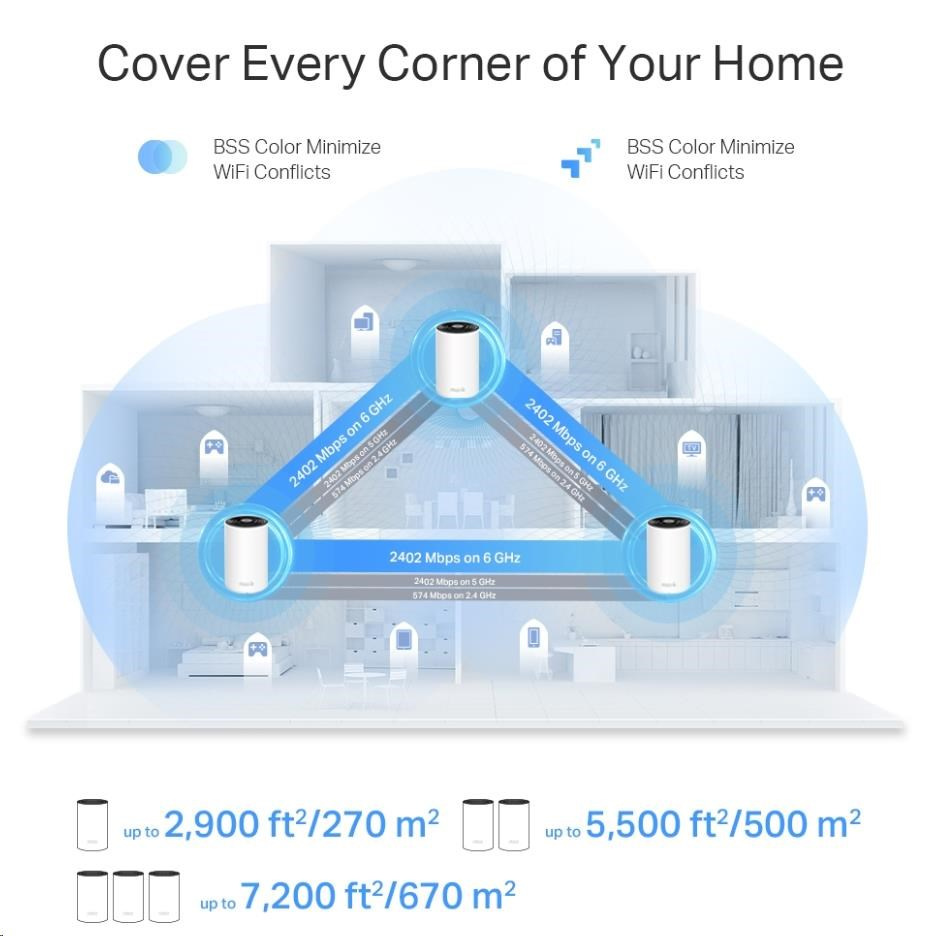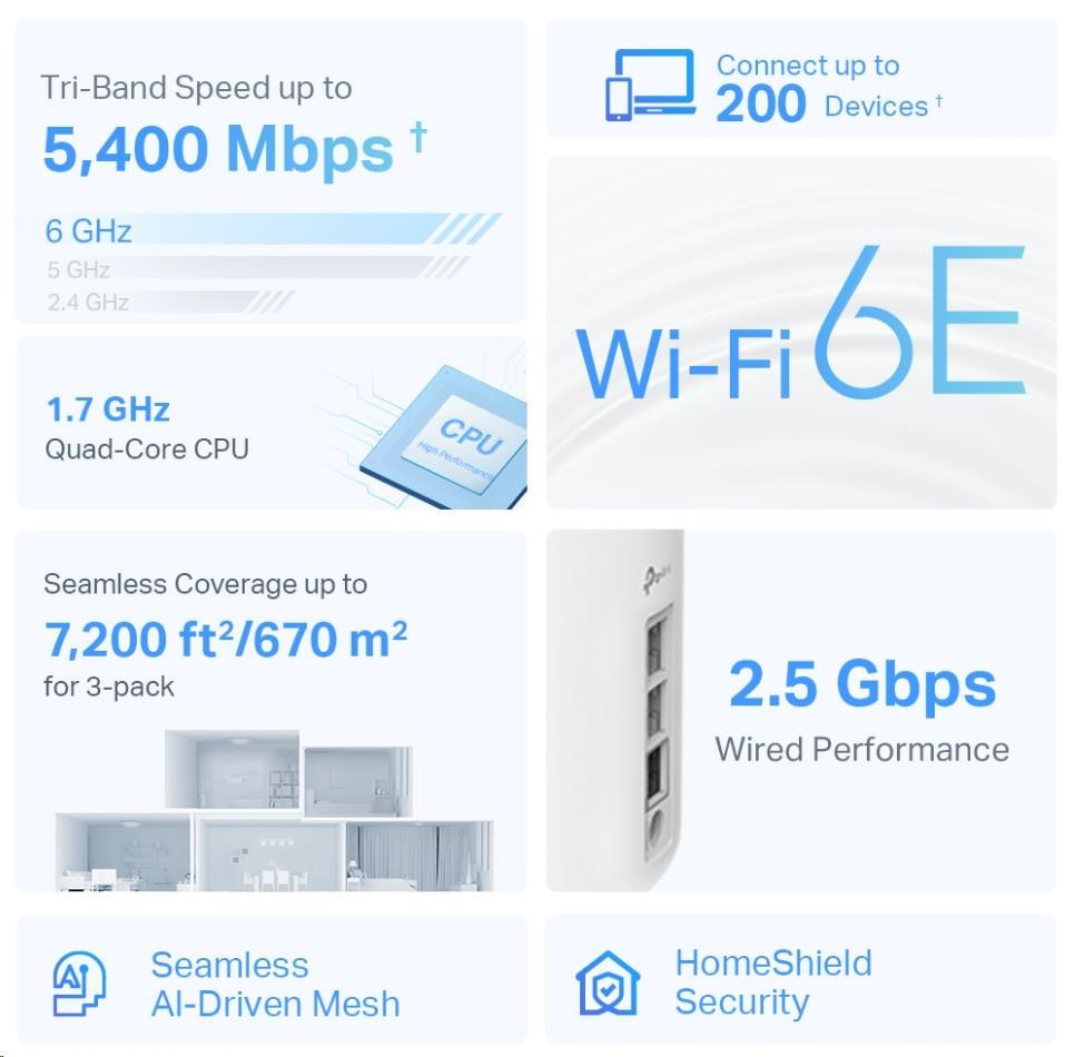 - Wi-Fi 6E pokrytí celé domácnosti – pokryjte plochu až 670 m2 ničím nerušeným Wi-Fi signálem příští generace a zapomeňte na mrtvé zóny pokrytí a načítání do vyrovnávací paměti
