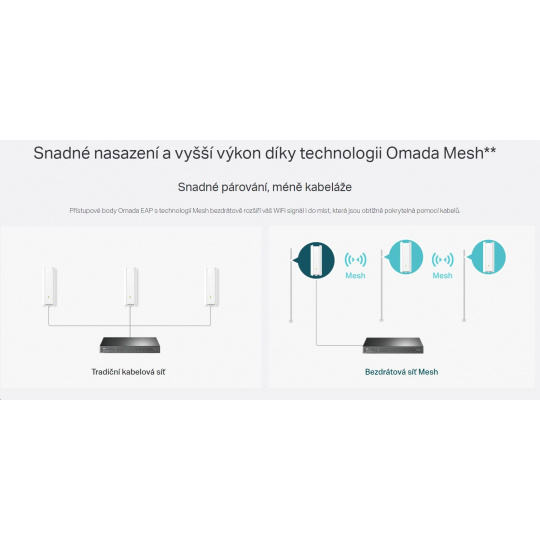 - Technologie Omada Mesh: Umožňuje bezdrátovou konektivitu mezi přístupovými body k získání prodlouženého dosahu a flexibilního nasazení.