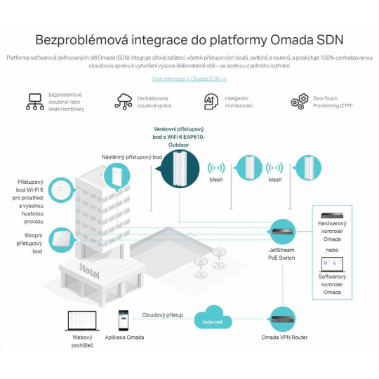 - Centralizovaná cloudová správa: Integrace s platformou Omada SDN umožňuje cloudový přístup a vzdálenou správu.