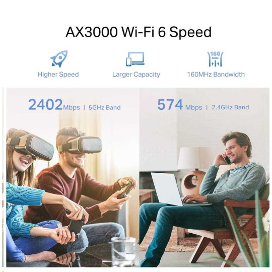 - Dvoupásmová síť Wi-Fi 6 – oddělená pásma 5 GHz (2 402 Mbit/s) a 2,4 GHz (574 Mbit/s) sítě Wi-Fi přinášejí díky nejnovějším technologiím vyšší rychlost a větší propustnost.