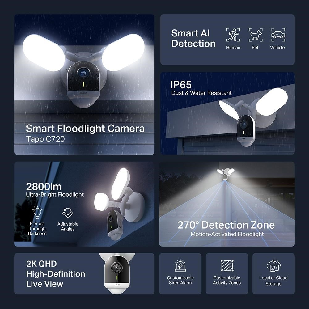 - - ýkonný, plně nastavitelný reflektor Tapo C720 a barevné noční vidění vidí až do vzdálenosti 30 metrů, takže můžete klidně spát s vědomím, že vaše okolí je v bezpečí.