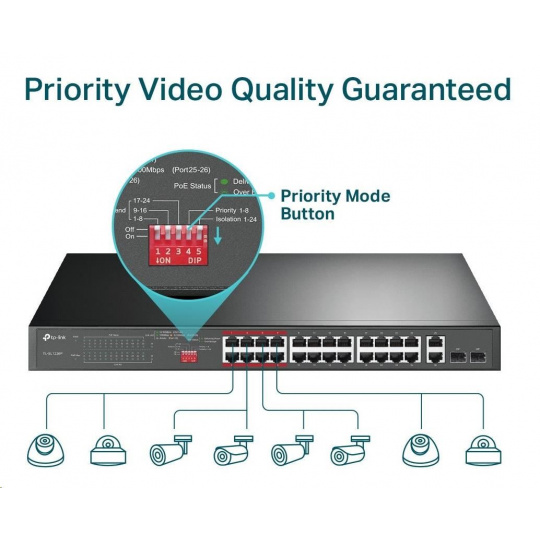 - Prioritní režim zajišťuje vysokou prioritu portů 1–8 a zaručuje kvalitu citlivých aplikací, jako je video monitor