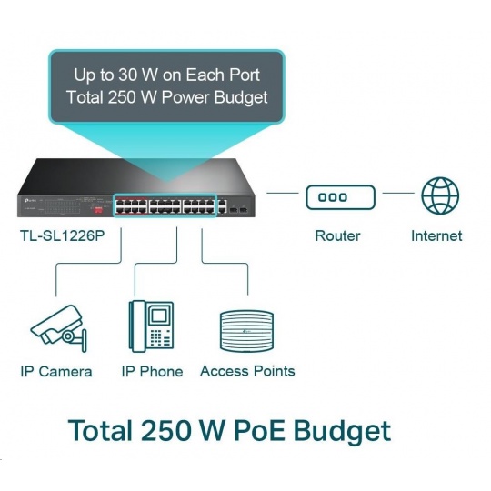 Vyhovuje standardu 802.3af/at PoE + a podporuje až 30 W napájení na každém PoE portu. Celkový výkon napájení až 250 W PoE pro 24× PoE porty, umožňuje široké spektrum aplikací, jako je dohled, kanceláře, koleje a malé podniky. Je plně kompatibilní s IP kamerami, přístupovými body, IP telefony, počítači, tiskárnami atd.