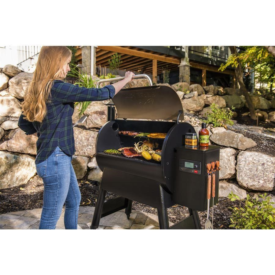 Tento elektrický gril na dřevěné pelety nabízí všestranný teplotní rozsah od 165 °F do 500 °F, ideální pro přesné uzení, pečení, grilování a BBQ. S napětím 120 V AC a výkonem 95 W se rychle zahřívá a udržuje konzistentní teplotu. Jednoduše jej zapojíte do nejbližší zásuvky pomocí přiloženého 6stopého napájecího kabelu D2 NEMA. Díky připojení WiFIRE® můžete sledovat vaření odkudkoli pomocí aplikace Traeger. Má kapacitu zásobníku na pelety 18 liber a pohodlné čištění zásobníku usnadňuje rychlou změnu příchutí pelet. Pro dostatek místa na vaření jsou k dispozici dvě řady porcelánem potažených ocelových roštů s celkovou varnou plochou 780 čtverečních palců. Součástí balení je také jedna sonda na maso Traeger, která usnadňuje kontrolu vnitřní teploty masa.