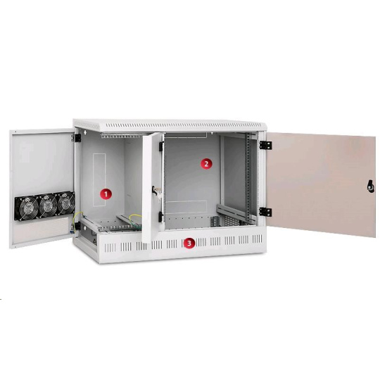 Chlazení provětráváním díky perforaci skeletu a bočních dvířek je možno podpořit instalací ventilátorů pro nástěnné rozvaděče (RAX-CH-X07)