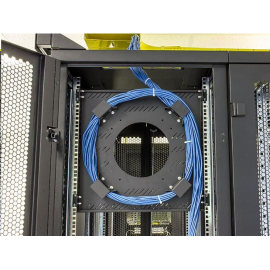Držák je možno instalovat ve svislé poloze (10U) na 19“ vertikální lišty (obvykle na zadní stranu rozvaděče), nebo po otočení úchytů vodorovně mezi vertikály podobně jako klasickou polici. Nosné trny namontované kolem středového otvoru zajišťují poloměr ohybu uložených kabelů a brání jejich poškození.
