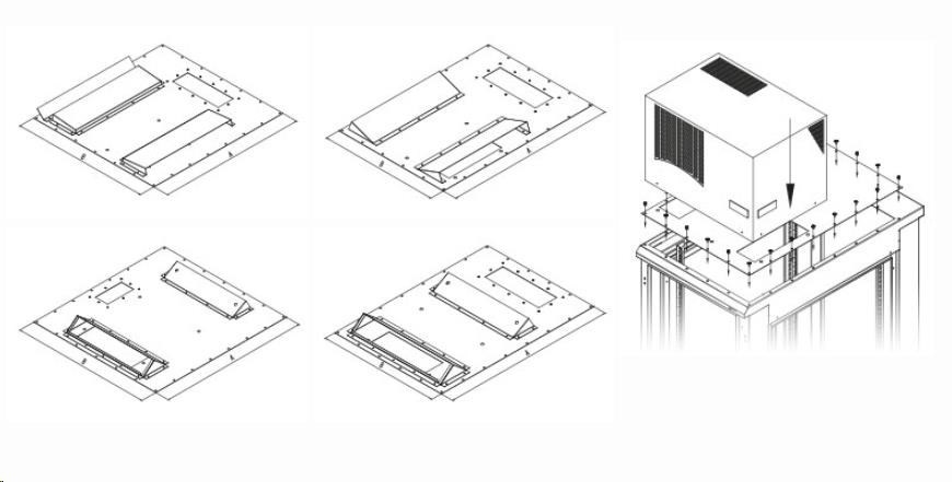 Abychom využili plně potenciál klimatizačních jednotek nasměrováním chladícího vzduchu přesně podle potřeb instalovaných technologií, dodáváme pro jejich montáž na stojanové rozvaděče řady RDE a RIE instalační redukce. Jedná se o kovový panel, který se šroubuje na velkoformátový otvor v horním dílu rozvaděče a na který se umístí klimatizace. Redukce jsou symetrické, takže změna orientace proudění vzduchu je možná otočením redukce. Různé velikosti redukcí a orientace otvorů pro chladící vzduch jsou v tabulce na této straně. Pro snadný přístup k ovládacímu panelu termostatu je ho možno namontovat ve 2 pozicích pouhým zasunutím do konektoru (viz. instalační manuál).