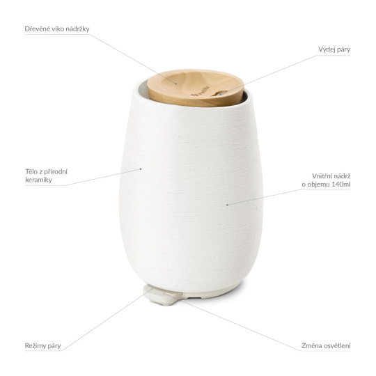 Difuzér je vyroben z čistě přírodních materiálů, konkrétně keramiky a dřeva.
