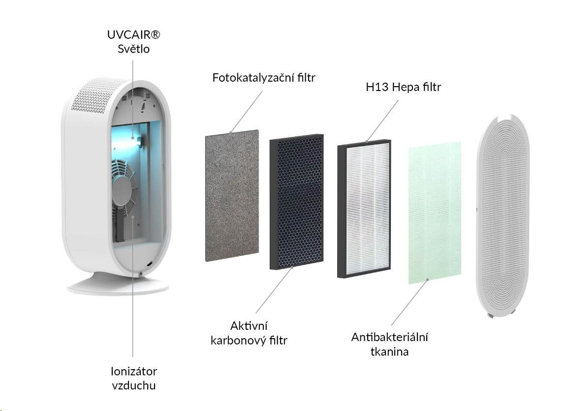 6 násobný filtrační systém odstraňuje ze vzduchu prach, pyl, zvířecí alergeny, bakterie a viry, koronaviry, spory plísní. Nejrozšířenější alergeny jsou tak ze vzduchu odstraněny.