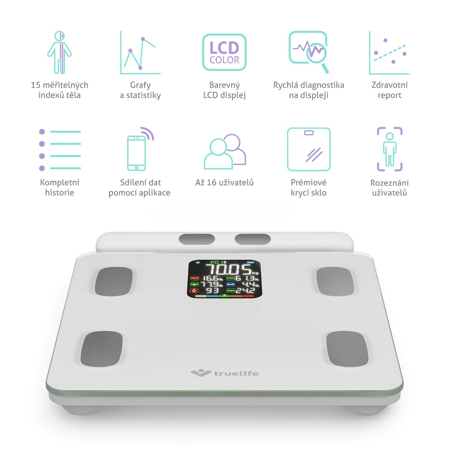 Zjistěte o svém těle více než jen pouhou hmotnost. Každý jsme originál a jedinečnou skladbu má i naše tělo, proto o něm chytrá váha TrueLife FitScale W8 BT White prozradí detaily. Technologie TrueLife PrecisionIQ+® využívá 8 vysoce citlivých senzorů a s pomocí bioelektrické impedanční analýzy změří celkovou tělesnou kompozici. Na přehledném barevném LCD displeji zobrazí celkem 7 údajů - kromě hmotnosti také třeba procento tuku, svalů či vody. Propojením přes Bluetooth s aplikací získáte přehledný report zahrnující 15 tělesných indexů včetně jejich popisu. Váha je schopna sledovat až 16 uživatelů, u kterých v aplikaci zaznamená 15 posledních měření. Každého uživatele automaticky rozezná, takže není třeba nic přepínat. Kdokoliv má však možnost použít váhu i bez aplikace. Prémiové tvrzené krycí sklo je elegantní a velmi odolné s nosností až 180 kg. Při vážení si můžete zvolit jednotky, a to buď kilogramy nebo libry. Vážící odchylka činí pouhých 0,1 kg, takže vaše výsledky budou opravdu přesné.