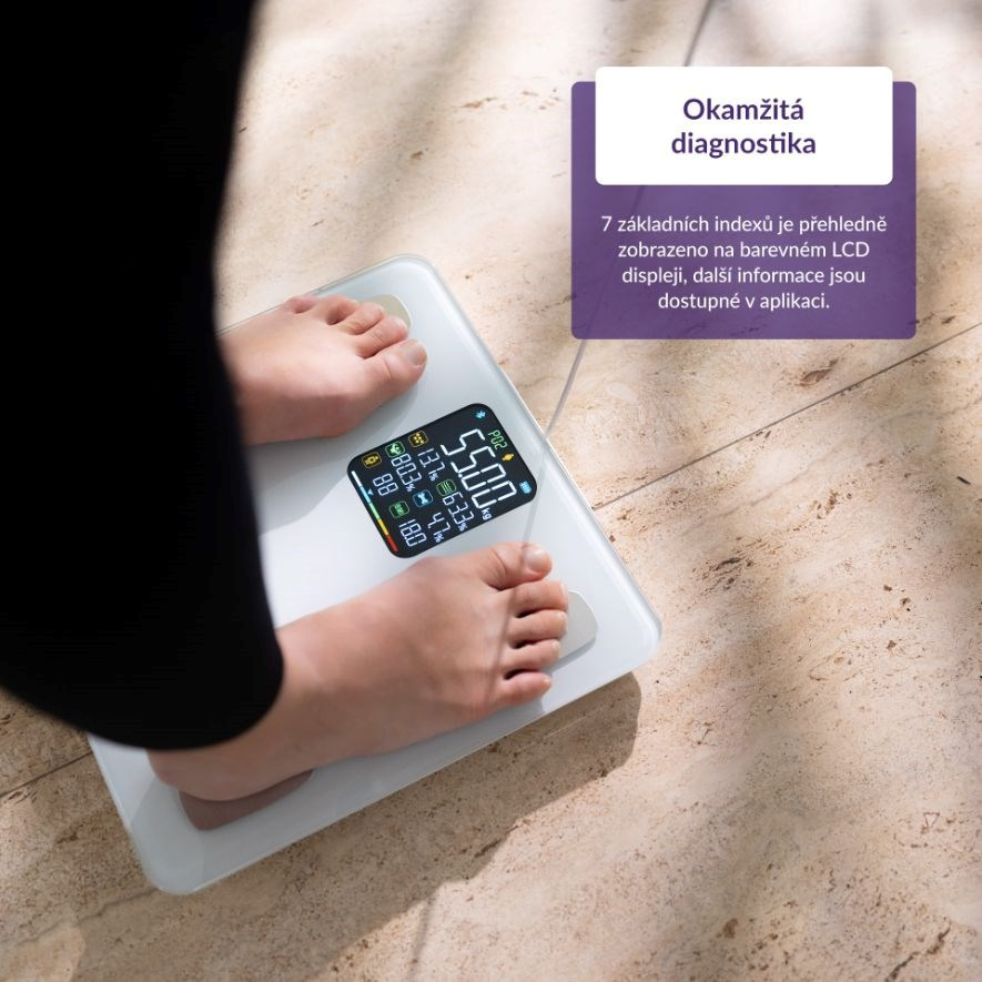 Přehledný LCD displej ukazuje okamžitě 7 tělesných indexů včetně hmotnosti.