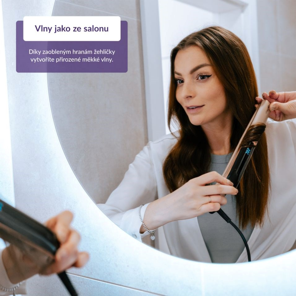 Perfektní vlasy jako z titulky časopisů získáte rychle a v pohodlí domova. Žehlička je vybavena ionizátorem s technologií TrueLife UltraIonic®, který generuje 10 milionů záporných iontů zajišťujících, že se vlhkost z vlasů odpaří rychleji. Na vlas působí zevnitř a vy tak svůj vysněný účes vytvoříte během chvíle. Vaše vlasy budou vyživenější, zdravější, lesklejší, zkrátka zazáříte. Teplotu, kterou zřetelně zobrazuje velký LED displej, si nastavíte sobě na míru. K dispozici je až 12 možností nastavení teploty v rozsahu od 120 °C do 230 °C.