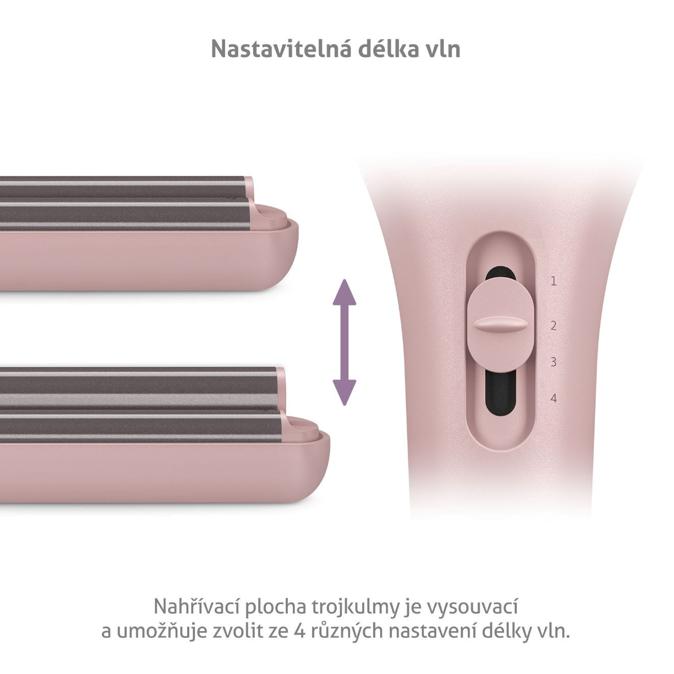 Nahřívací plocha trojkulmy je vysouvací a umožňuje zvolit ze čtyř různých nastavení délky vln.