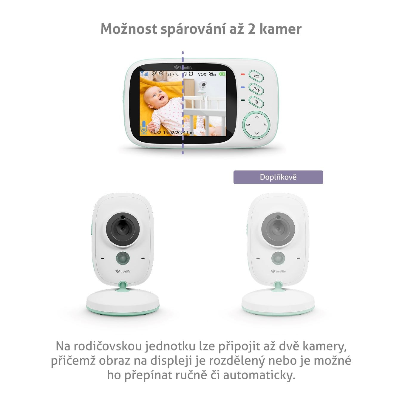 Na rodičovskou jednotku lze připojit až dvě kamery, přičemž obraz na displeji je rozdělený nebo je možné ho přepínat, ručně či automaticky.
