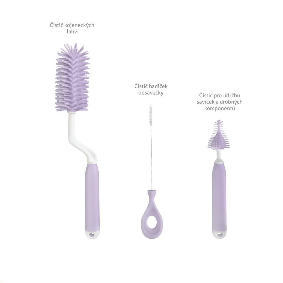 Každý rodič chce ochránit své miminko před různými nástrahami a o jeho zdraví se postaráte také důkladnou hygienou. V čistotě je třeba udržovat nejen okolní prostředí, ale také nejrůznější lahvičky, savičky a další příslušenství. Právě pro tyto účely slouží sada TrueLife Nutrio Cleaning Set. Navržena byla s ohledem na maximální pohodlí a bezpečnost, proto je vyrobena pouze z nejkvalitnějších materiálů bez obsahu BPA, ftalátů či jiných škodlivin. 3 typy kartáčů dokonale vyčistí různé typy příslušenství a lahviček z jakéhokoliv materiálu. Protiskluzová úprava otočné rukojeti zajišťuje pevné a bezpečné uchopení i mokrou rukou a minimální námahu. Tato sada v krásném fialovém provedení obsahuje vše, co potřebujete k údržbě veškerého příslušenství, lahviček a saviček pro vaše děťátko.