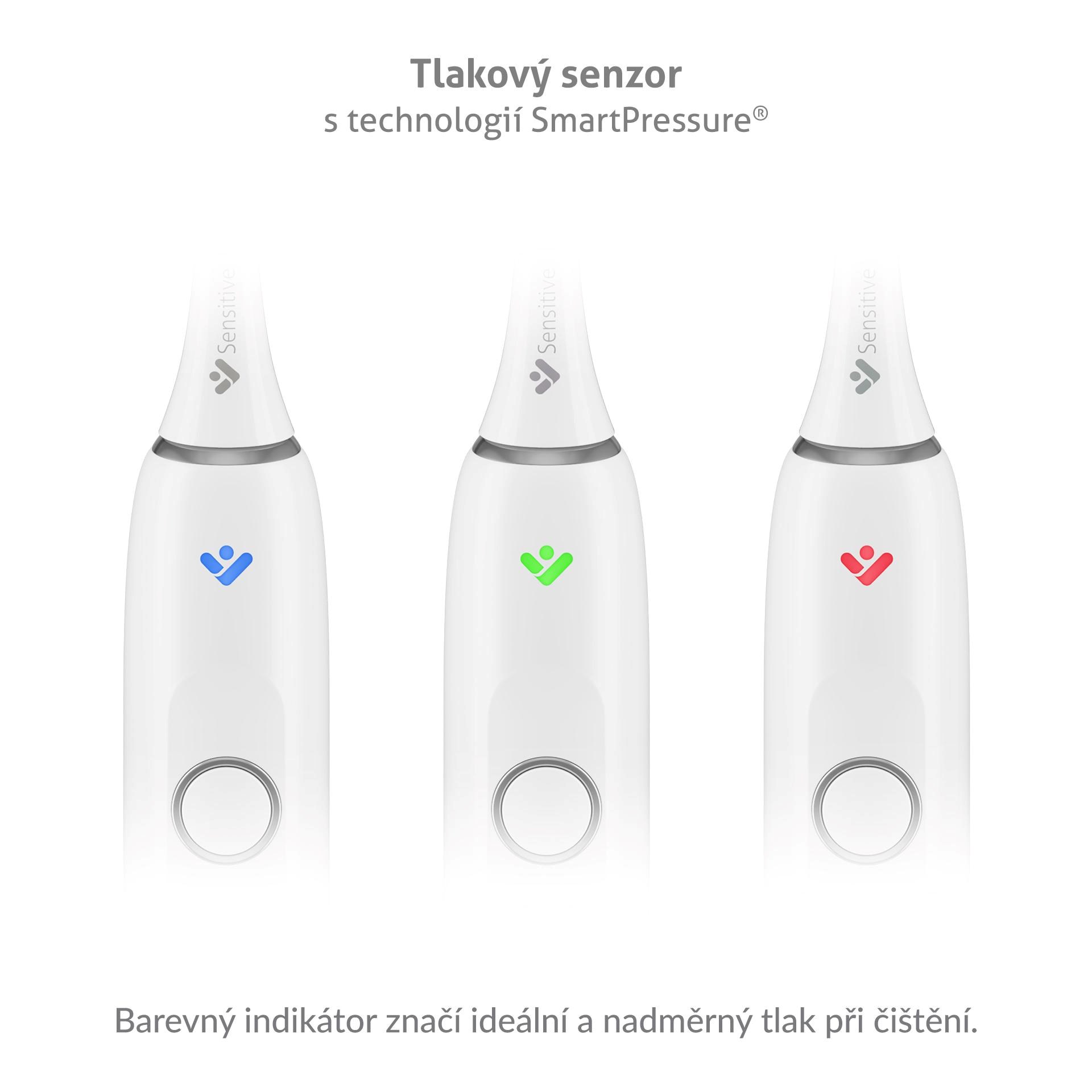 Technologie SmartPressure® sleduje tlak, jakým na zuby a dásně působíte, a barevně vás navede k ideálnímu čištění. Modrá značí optimální tlak, zelená maximum, a při červeném světle vás kartáček přerušenými vibracemi upozorní, že je čas zvolnit. Díky tomu, že je indikátor viditelný jak zepředu, tak i zezadu kartáčku, máte v zrcadle vždy jasnou kontrolu nad svojí technikou čištění a tím i nad zdravím celé ústní dutiny. Sonická technologie SonicTrue® pak pomocí jemných vibrací a mikrobublinek čistí i hůře přístupná místa, a přitom zůstává šetrná k zubní sklovině i citlivým dásním.