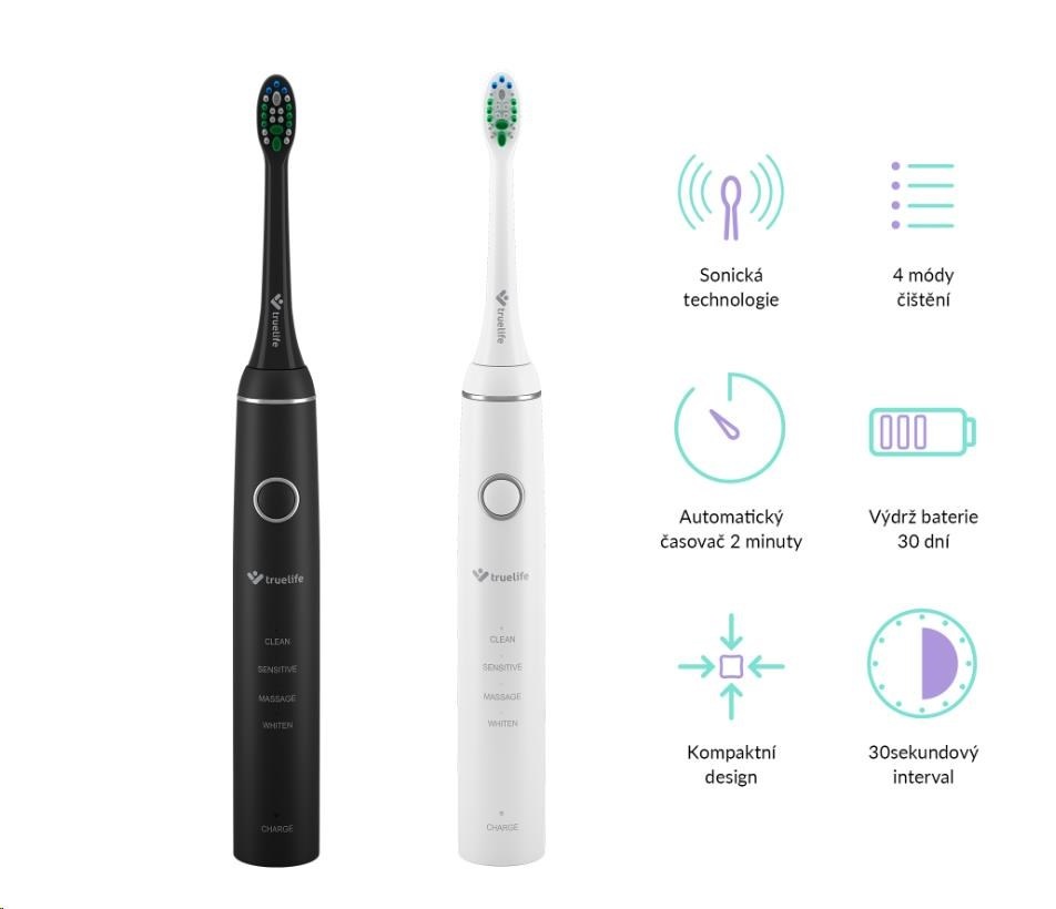 Chcete mít zdravé zuby a dásně? Nestresovat se z každé návštěvy zubaře? Na kartáček TrueLife SonicBrush Compact s moderní sonickou technologií se můžete spolehnout vy, i váš partner. V sadě Truelife SonicBrush Compact Duo totiž najdete dva sonické kartáčky (v černé a bílé variantě), čtyři zubní hlavice, dvě cestovní pouzdra a dvě dobíjecí základny. Dopřejte si i vy exkluzivní zubní péči, díky které získáte zářivý úsměv a nedáte šanci škodlivým bakteriím. Hlava kartáčku kmitá vysokou frekvencí a každým pohybem odstraní maximum zubního plaku. Můžete vybírat ze 4 režimů čištění. Baterie kartáčku vydrží až 30 dní.