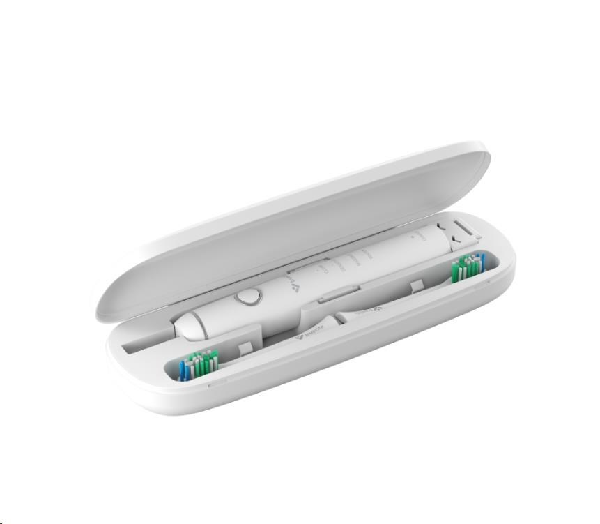 Těla kartáčků jsou kompaktní a velmi lehká. 30 denní výdrž baterie kartáčků vám zajistí, že nemusíte na cestách řešit nabíjení. Dvě cestovní pouzdra v bílé a černé barvě, zaručí bezpečné a hygienické uložení kartáčku.