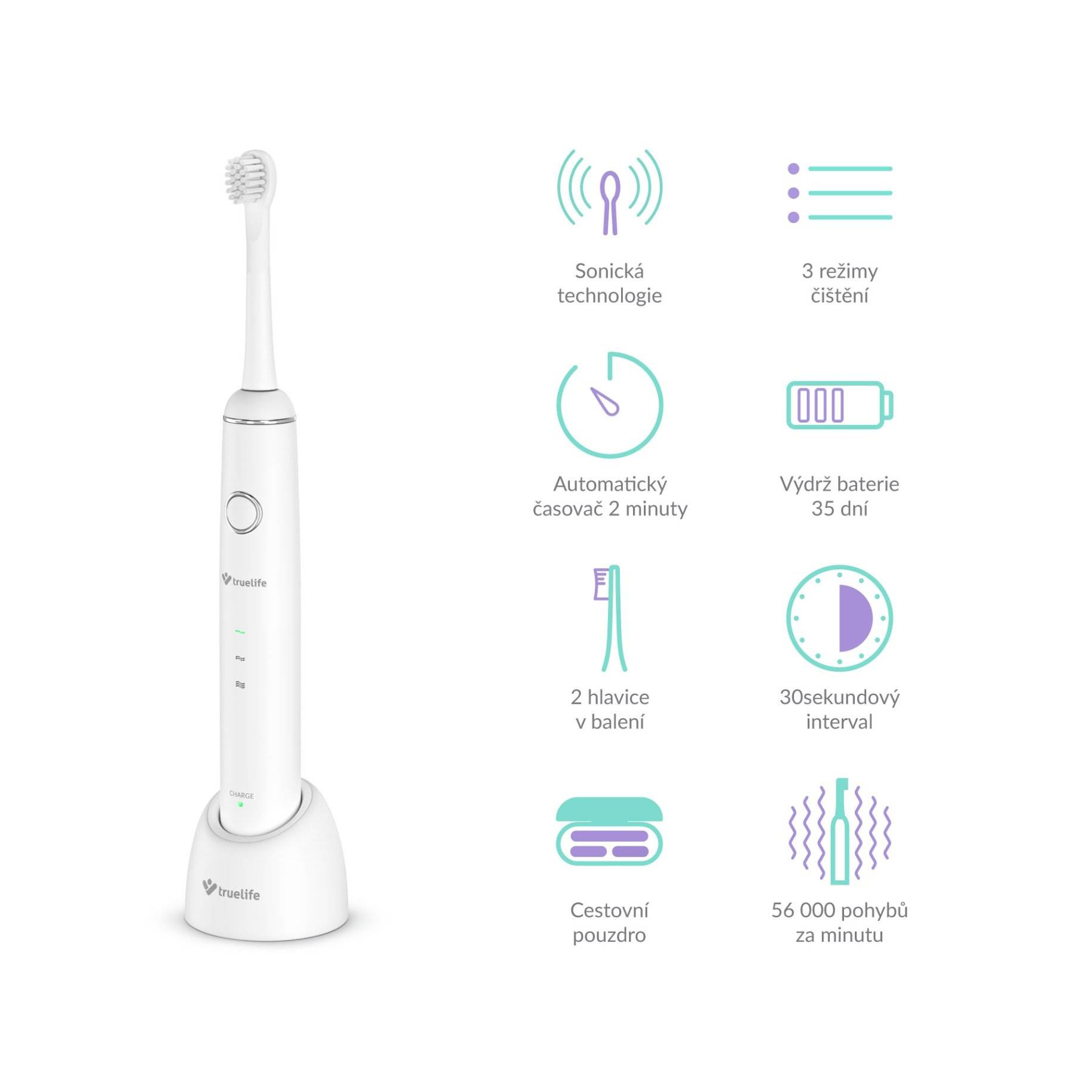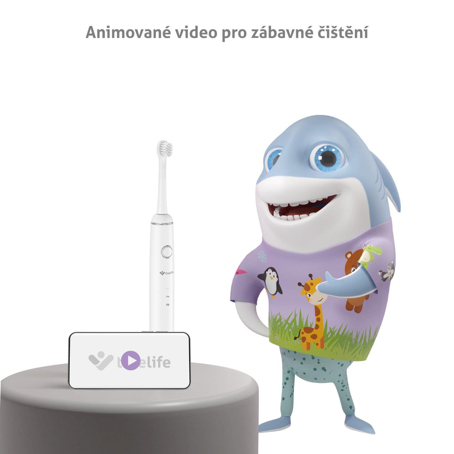 Většina dětí si čištění zubů příliš neužívá, a tak ho často jen tak odbyde. Se sonickým kartáčkem Truelife SonicBrush Junior J100, který je přizpůsoben potřebám dětí od 7 do 14 let, může být ale čištění zubů i zábava. Díky barevným polepům a zábavné výukové video animaci snadno proměníte rutinní činnost v legraci a vaše dítě se bude na čištění zubů těšit. Kartáček je plně přizpůsoben dětským potřebám, tělo i hlavice kartáčku mají vhodnou velikost pro dětská ústa a štětiny kartáčku jsou pro děti dostatečně jemné. Zároveň disponuje sonickou technologií SonicTrue®, díky které zvládne až 56 000 čistících pohybů za minutu a efektivně tak odstraní až 99 % zubního plaku. Kartáček je dobíjecí a baterie má výdrž až 35 dnů, takže s ním můžete pohodlně cestovat nebo ho přibalit dítěti s sebou na prázdniny. Součástí balení je cestovní pouzdro a dvě hlavice Soft.