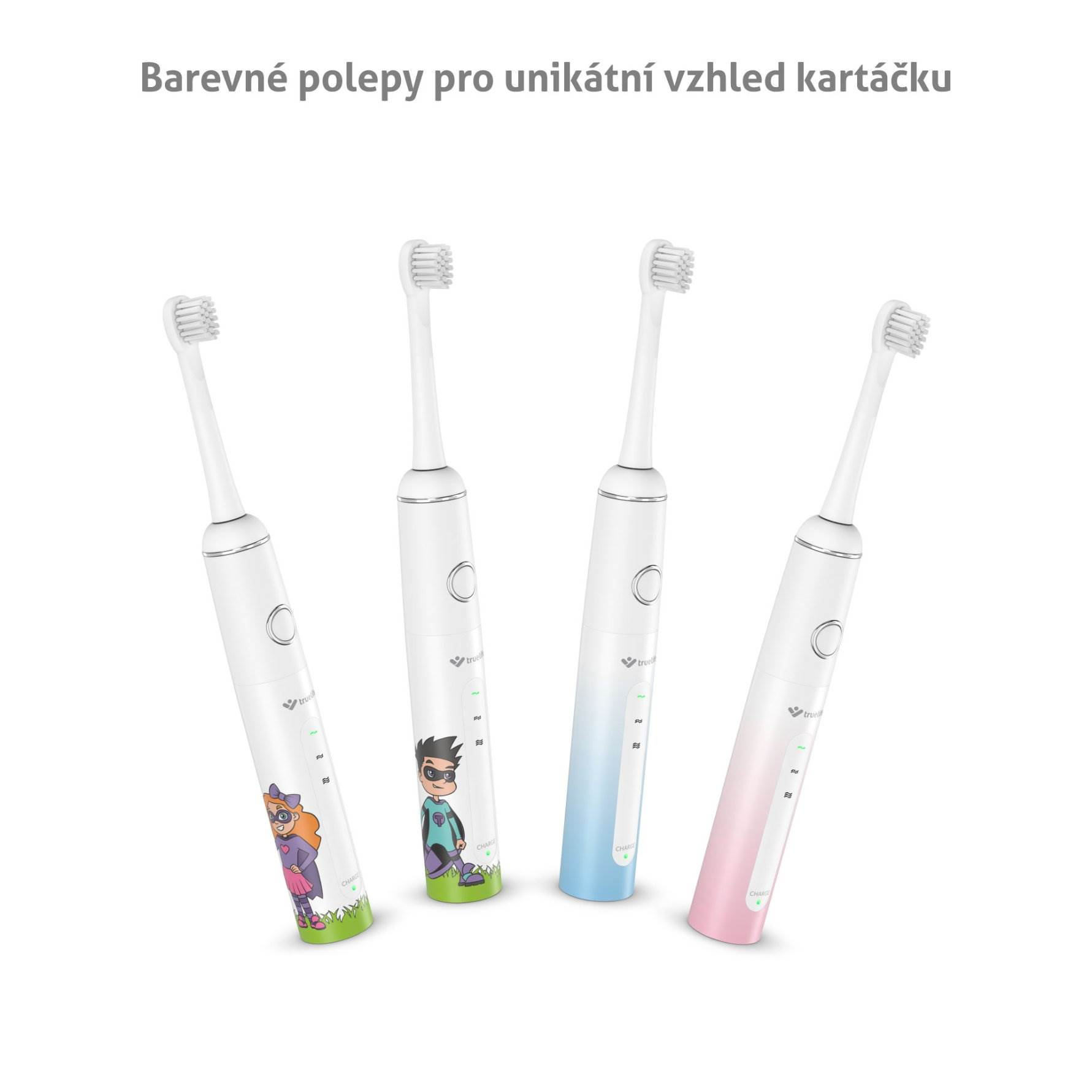 Součástí balení jsou 4 různé polepy, kterými si kartáček ozdobí kluci i holky.