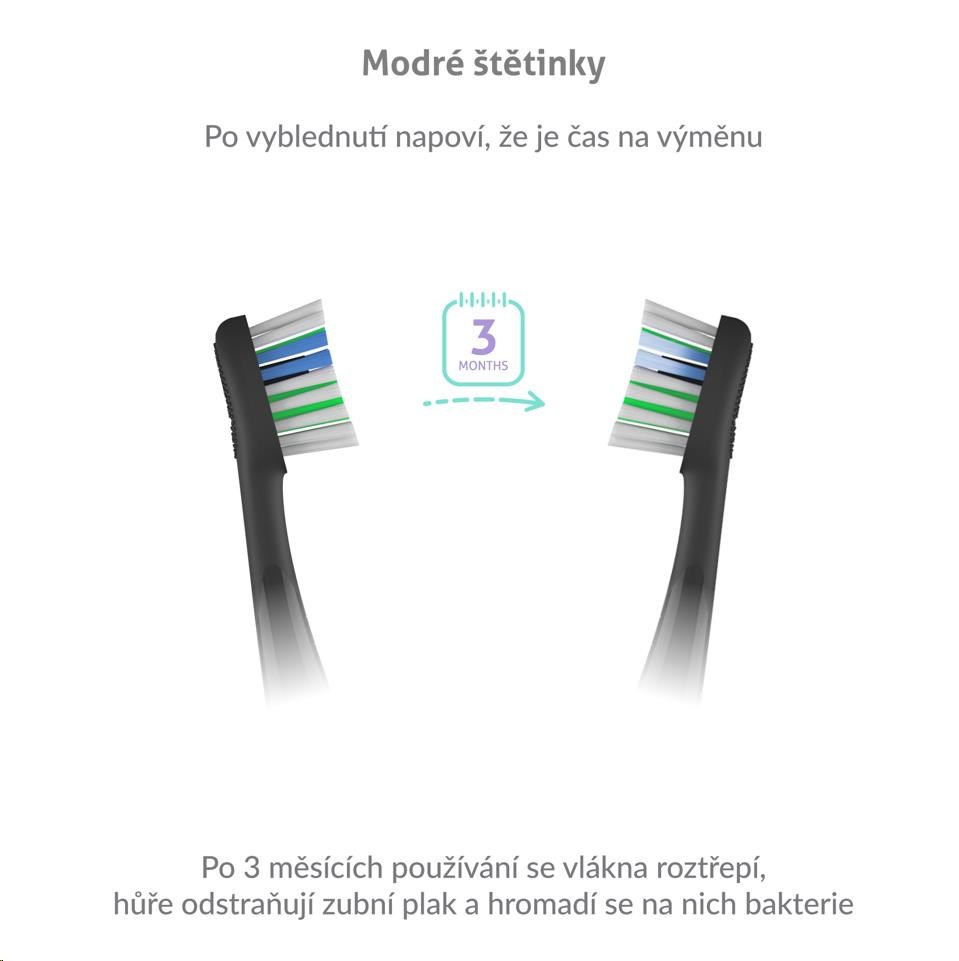 Hlavice vydrží až 3 měsíce používání, poté se začnou třepit, ztrácí účinnost a navíc se na nich hromadí bakterie. Naštěstí jsou hlavice opatřeny modrými štětinami, které po 3 měsících vyblednou a vy tak víte, že je načase hlavice vyměnit.