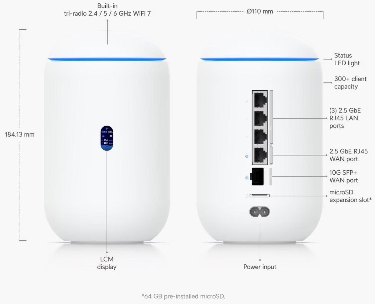 Popis produktu UniFi Dream Router 7 od Ubiquiti je řešení sítě vše v jednom pro domácnosti a malé kanceláře. Jedná se o výkonné zařízení se 4-jádrovým CPU, 3 GB RAM, které kombinuje Router, WiFi 7 AP, 3-portový 2.5G switch s možností 802.3af PoE na jednom portu. Pro připojení do sítě disponuje 2.5G WAN portem a 10G SFP+ WAN portem. Router má předinstalované aplikace UniFi Network/Protect/Access/Talk a microSD slot, který slouží jako uložiště pro kamerové záznamy (64GB SD karta součástí balení). Pomocí UniFi network dokáže spravovat dalších 30+ zařízení z řady UniFi a pro UniFi protect umožňuje nahrávat 1x 4K kameru, 2x 2K kamery nebo 5x HD kamer. Třešničkou na dortu tohoto elegantního routeru je malý displej pro zobrazení aktuálního síťového provozu. Vestavěné Tri-Band WiFi 7 AP podporuje nejnovější standard 802.11be s modulační rychlostí až 5,7 Gbps v 6GHz pásmu, až 4,3 Gbps v 5GHz pásmu a až 688 Mbps ve 2.4 GHz pásmu a šifrování WPA3. Klíčové vlastnosti • Tri-Band WiFi 7 AP s podporou 802.11a/b/g/n/ac/ac/ax/be • 5,7 Gbps (6GHz) + 4,3 Gbps (5GHz) + 688 Mbps (2,4GHz) • (1) 10G SFP+ WAN + (1) 2.5G WAN + (3) 2.5G LAN - 1 port s podporou PoE-out (802.3af) • PoE budget 15,4W • Slot na MicroSD karty pro ukládání záznamů z UniFi Protect (64GB SD karta součástí balení) • 0.96" LCD barevný displej pro zobrazení síťového provozu a vytížení • Předinstalované UniFi aplikace Network, Protect, Access, Talk, Connect Obsah balení • Zařízení • 64GB MicroSD karta • Napájecí kabel • Nástroj na vyjmutí microSD karty Technické parametry Bezdrátové vlastnosti Bezdrátové frekvence:2.4 + 5 + 6 GHz (triple band) WiFi standardy:802.11n, 802.11a, 802.11ac, 802.11b/g, 802.11ax, 802.11be MU-MIMO:Ano Přenosová rychlost - 5GHz [Mb/s]:4300 Přenosová rychlost - 2.4GHz [Mb/s]:688 Přenosová rychlost - 6GHz [Mb/s]:5700 Vysílací výkon 2.4GHz [dBm]:23 Vysílací výkon 5GHz [dBm]:26 Vysílací výkon 6GHz [dBm]:24 Šifrování:WPA, WPA2, WPA3 2.4GHz MIMO:2 x 2 5GHz MIMO:2 x 2 6GHz MIMO:2 x 2 Typ antény:Vestavěná Roaming:Ano Zisk antény [dBi]:6, 7, 5 Konektory a rozhraní Rychlosti WAN:(1) 10/100/1000/2500Mbps + (1) 10Gbps SFP+ Možnost více WAN:Ano Rychlost LAN:(3) 100/1000/2500Mbps Gigabit LAN:Ano Optické rozhraní:(1) 10Gbps Ostatní:LCD displej Napájení Typ napájení:Ze sítě (230V) Typy PoE:PoE-Out (pouze) Podporované PoE-Out standardy:802.3af Počet PoE Out portů:1 Max. spotřeba energie [W]:26 Fyzické charakteristiky Provedení:Desktop Použití:Vnitřní Šasi:Plastové Tlačítka:Reset Provozní teplota [°C]:-10 až 40 Hmotnost [g]:1100 Šířka [mm]:110 Výška [mm]:184 Hloubka [mm]:110 Hardware CPU:ARM Cortex-A53 Frekvence CPU [MHz]:1500 Počet CPU jader:4 RAM [MB]:3072 Software Podporované VPN:L2TP, IPSec, OpenVPN, WireGuard Předinstalovaný kontroller:UniFi Network, UniFi Protect, UniFi Talk, UniFi Access, UniFi Connect Operační mód:AP Router Management:UniFi Network, Mobilní aplikace Podpora IPv6:Ano.
