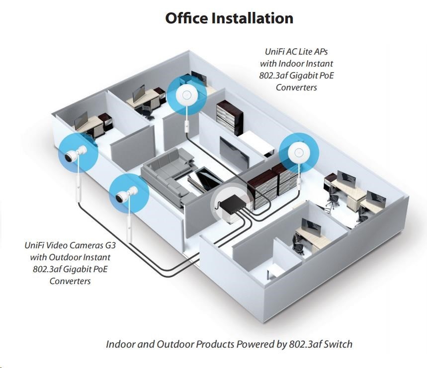 Pomocí tohoto gigabitového konvertoru je možné napájet jednotky UBNT switchem s aktivním PoE dle 802.3af (48V). Konvertor komunikuje se switchem dle 802.3af a do výstupu propouští již klasické pasivní PoE, v tomto případě 24V/0,5A. Lze použít se všemi jednotky od Ubiquity (je kompatibilní i s routerboardy od Mikrotiku).