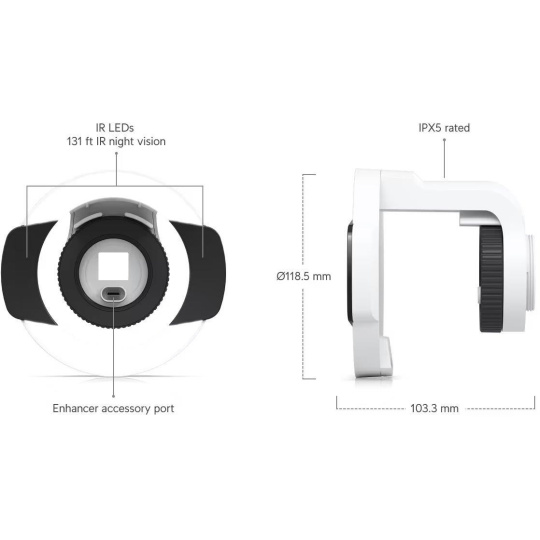 Popis produktu Volitelné příslušenství ke kameře UVC G5 Professional. Jedná se o noční IR přisvícení s intenzivním bílým led světlem (600 lumenů) a dosahem až 40m. Nespornou výhodou je jednoduchost instalace, zapojení přísvitu do připraveného konektoru přímo v těle kamery, venkovní provedení a voděodolnost IPX5. Maximální spotřeba přísvitu je 4,5W. Technické parametry KameraPřísvit:IR, Bílé světloDosah přísvitu [m]:40NapájeníMax. spotřeba energie [W]:4,5Fyzické charakteristikyStupeň krytí:IPX5Provozní teplota [°C]:-20 až 50Hmotnost [g]:210Šířka [mm]:119Výška [mm]:119Hloubka [mm]:103.