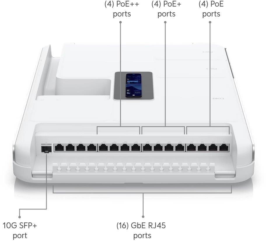 Popis produktu Dream Wall je další z řady zařízení UniFi All-in-one. Ukrývá v sobě bránu s firewallem, Wi-Fi 6 access point, NVR a switch s funkcí PoE. Jednotka poskytuje široké možnosti připojení do sítě. Nabízí možnost připojení 10Gbps SFP+ portem nebo ethernetovým portem 2.5Gbps. Pro připojení dalších zařízení v síti LAN pak nabízí 10Gbps SFP+ port spolu se 17 ethernetovými 1Gbps porty, z nichž 12 disponuje funkcí PoE (4x POE++, 4x POE+ a 4x POE). Z výroby je zařízení osazeno jedním hot-swap zdrojem s výkonem 550W a k dispozici je druhá pozice pro redundanci. Maximální spotřeba zařízení činí 532W včetně připojených napájených zařízení. Radiová část podporuje nejnovější standard WiFi 6 (802.11ax), je zpětně kompatibilní se staršími standardy a disponuje technologií MIMO 2x2 (2.4 Ghz) a 4x4 (5 GHz) s maximální modulační rychlostí 300 + 2400 Mbps. Ke všem důležitým informacím o zařízení a síti se dostanete ihned díky integrovanému displeji s úhlopříčkou 4,7". Pro ukládání kamerových záznamů slouží předinstalovaná 512GB microSD karta a zařízení disponuje také vlastním SSD diskem s kapacitou 128GB. Podporované UniFi služby • UniFi Network Controller • UniFi Protect • UniFi Access • UniFi Talk • UniFi Connect Výhody UniFi řešení • Zero Handoff Roaming - bezvýpadkový přechod mezi jednotlivými AP • Wireless uplink (hodí se tam, kam není možné dostat datový kabel) • Až 4 SSID • Detailní statistiky provozu • Guest síť • Load balance - udržování rovnoměné zátěže / přepínání klientů • Omezování rychlosti pro každé SSID Technické parametry Bezdrátové vlastnosti Bezdrátové frekvence:2.4 + 5 GHz (dual band) WiFi standardy:802.11n, 802.11a, 802.11ac, 802.11b/g, 802.11ax Přenosová rychlost - 5GHz [Mb/s]:2402 Přenosová rychlost - 2.4GHz [Mb/s]:300 Vysílací výkon 2.4GHz [dBm]:23 Vysílací výkon 5GHz [dBm]:26 Šifrování:WEP, WPA, WPA2, WPA3 2.4GHz MIMO:2 x 2 5GHz MIMO:4 x 4 Typ antény:Vestavěná Roaming:Ano Zisk antény [dBi]:6 Konektory a rozhraní Rychlosti WAN:(1) 100/1000/2500Mbps Slot na paměťové karty:microSD - až 512GB Rychlost LAN:(17) 10/100/1000Mbps Gigabit LAN:Ano Optické rozhraní:(2) 10Gbps Ostatní:Dotykový displej, Bluetooth Napájení Typ napájení:Ze sítě (230V) Typy PoE:PoE-Out (pouze) Podporované PoE-Out standardy:802.3af, 802.3at, 802.3at - ultra PoE (60W) Redundantní napájení:Ano Počet PoE Out portů:12 PoE budget [W]:422 Max. spotřeba energie [W]:532 Napájení přes konektor/svorkovnici:230V AC Fyzické charakteristiky Provedení:Na zeď Použití:Vnitřní Tlačítka:Reset Provozní teplota [°C]:-10 až 40 Hmotnost [g]:8600 Šířka [mm]:342 Výška [mm]:549 Hloubka [mm]:62 Hardware CPU:ARM Cortex-A57 Frekvence CPU [MHz]:1700 Počet CPU jader:4 RAM [MB]:4096 Software Předinstalovaný kontroller:UniFi Protect, UniFi controller Operační mód:AP Router Management:UniFi controller Výchozí IP adresa:192.168.1.1 Výchozí jméno a heslo:Nastavuje se při prvním spuštění.