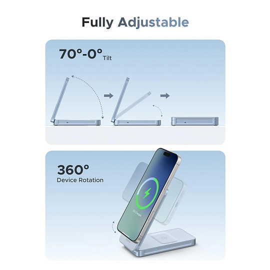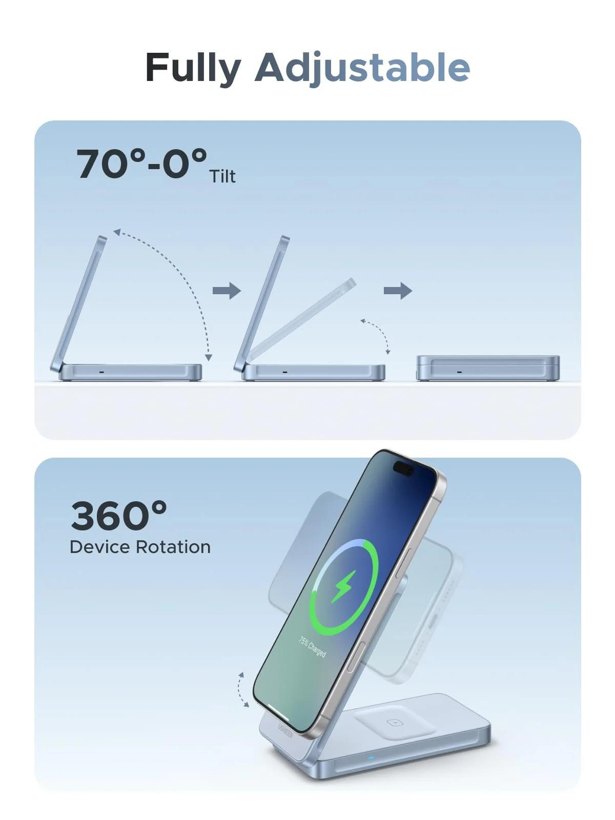 - Praktický stojan s rotací: Umožňuje otáčení zařízení během nabíjení – ideální pro sledování videí nebo práci při nabíjení