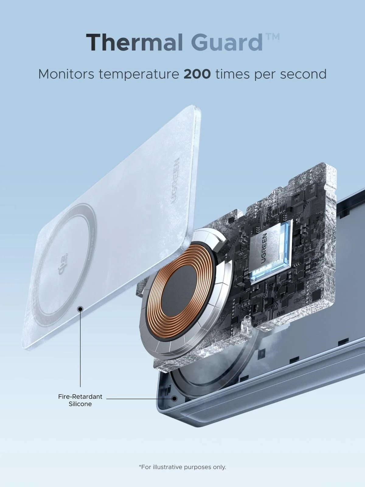 - Pokročilá tepelná ochrana: NTC senzory monitorují teplotu nepřetržitě, při 75 °C se nabíjení automaticky zastaví a při 55 °C obnoví. Díky účinnosti >65 % a 6vrstvé ochraně zůstává zařízení bezpečně chladné