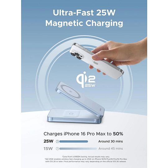 UGREEN magnetická bezdrátová nabíječka 2v1 MagFlow Qi2.2, 25W, MagSafe, stříbrná
