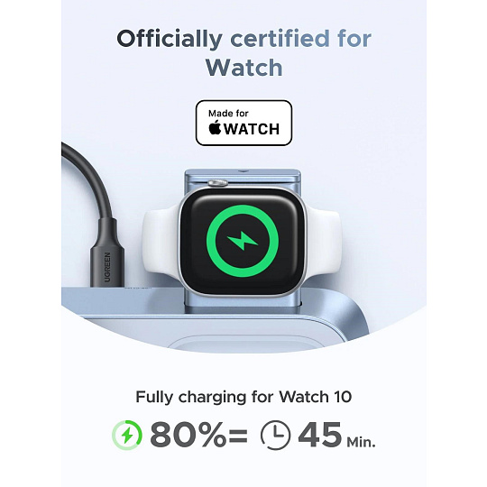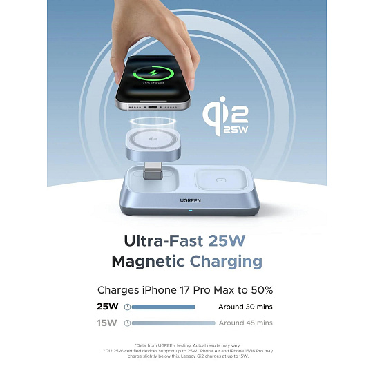 - Obsah balení: UGREEN Qi2 25W 3v1 nabíječka, 45W USB-C adaptér, 1m USB-C kabel (iPhone 16 vyžaduje iOS 26+ pro 25 W; iPhone 12–15 podporuje až 15 W)