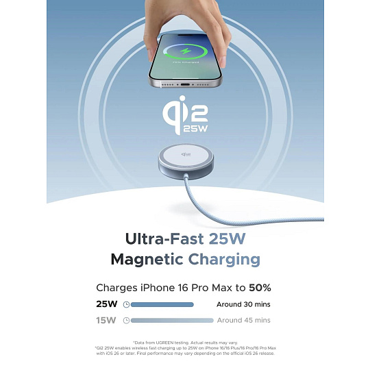 UGREEN magnetická bezdrátová nabíječka MagFlow Qi2.2 25W, MagSafe, stříbrná