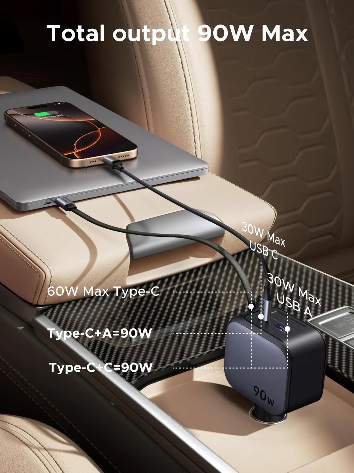 - 3v1 autonabíječka: Kombinace 60W PD zatahovacího USB-C kabelu + 7,5W USB-C portu + 7,5W USB-A portu. Nabíjí až 3 zařízení současně s inteligentním rozdělením výkonu.
