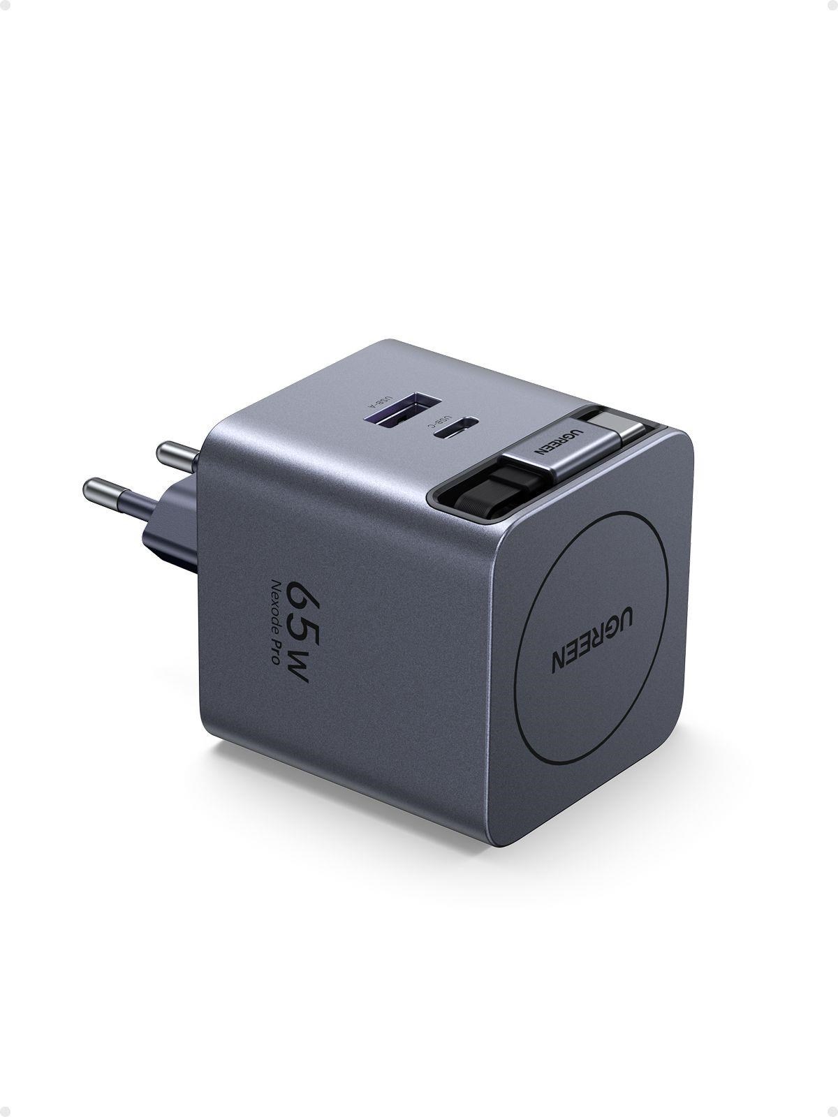 UGREEN síťová rychlonabíječka se zatahovacím kabelem 45W 3-Port, 2x USB-C, 1x USB-A, GaN, stříbrná