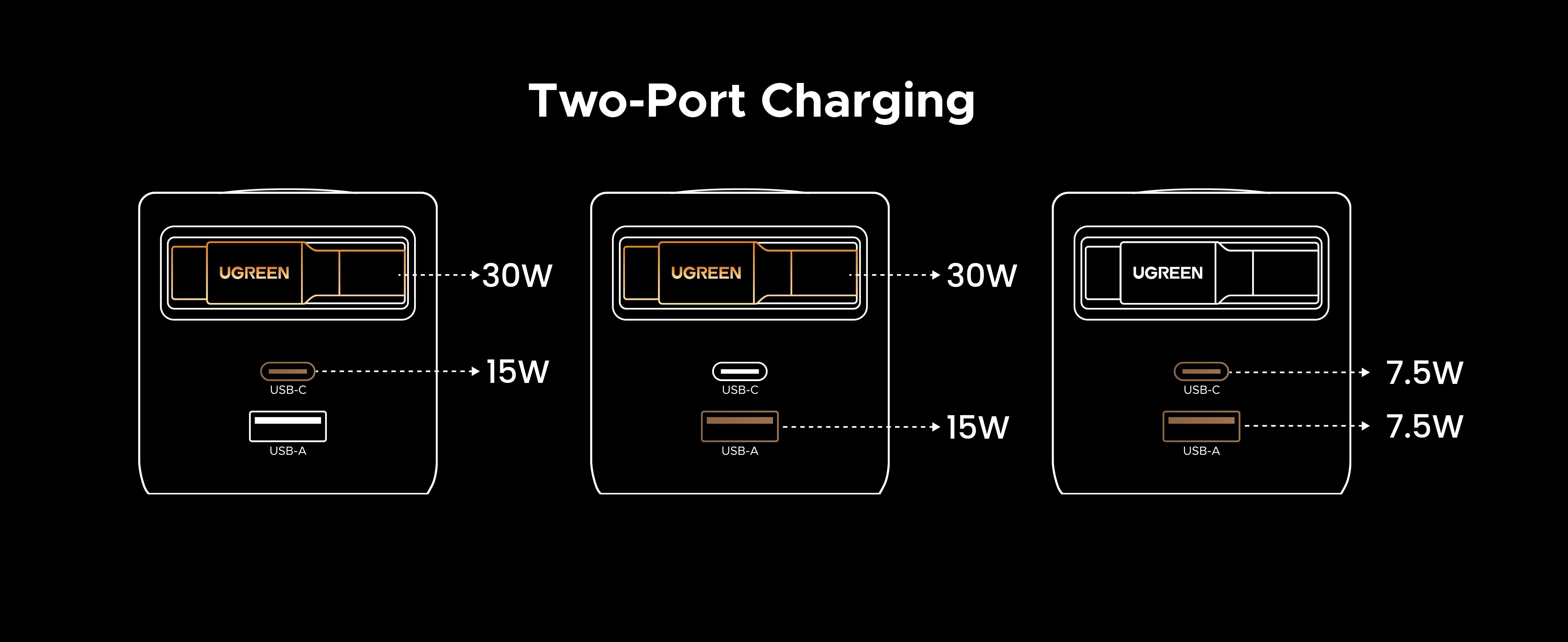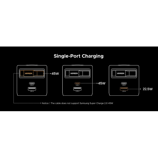 | Output | 45W Max USB-C1 kabel: 5V/3A , 9V/3A , 12V/3A , 15V/3A , 20V/2.25A 45W Max PPS:5-11V/2.75A USB-C2: 5V/3A , 9V/3A , 12V/3A , 15V/3A , 20V/2.25A 45W Max PPS:5-11V/4.5A USB-A: 5V/3A, 9V/2A, 12V/1.5A, 10V/2.25A 22.5W Max |