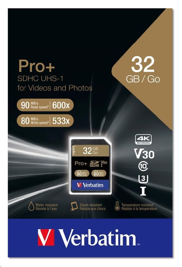 VERBATIM SDHC karta 32GB PRO+ Class 10, UHS-1 (R:90/W:80 MB/s)