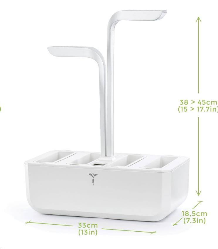 Zahrádka Véritable Classic se o vaše rostliny postará automaticky, což znamená, že dostanou správné množství vody a světla bez vašeho zásahu. Integrovaná nádrž na vodu poskytuje až čtyři týdny autonomního zavlažování, což je ideální pro zaneprázdněné jednotlivce nebo časté cestovatele. Můžete si užívat čerstvé bylinky, zeleninu a květiny s minimálním úsilím, zatímco zahrádka pracuje za vás. Spotřeba energie zahrádky je velmi nízká, příkon LED je pouhých 10 W. Vzhledem k tomu, že závlaha není řešena pumpou, zahrádka nevydává žádný zvuk.