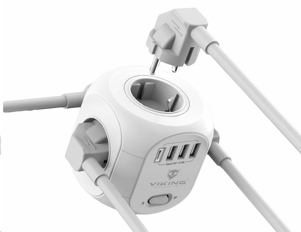 Síťový adaptér Viking AC Cube je praktickou kombinací čtyř zásuvek, čtyř USB portů a 1,8 m prodlužovacího kabelu v jednom, který šetří místo a umožňuje napájení až 8 zařízení současně.