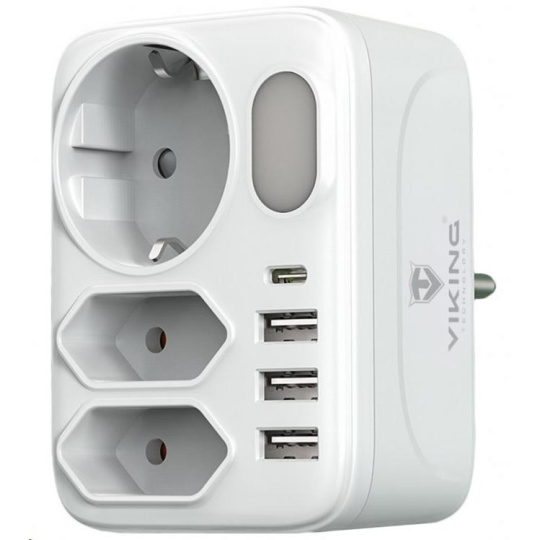 Viking AC34 - revoluční elektrický rozbočovač, který rozšiřuje standardní zásuvku na další 3 AC 230V výstupy, 3 USB-A výstupy a 1 USB-C výstup. Můžete tak nabíjet až 7 zařízení současně!