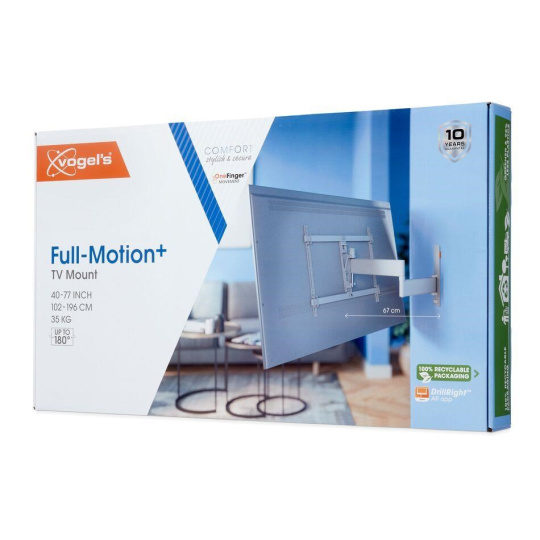 S tímto stylovým nástěnným držákem řady COMFORT Full-Motion+ si můžete sledování svého velkého televizoru maximálně užít. TV 3643 se může otáčet až o 180° a naklánět až o 20° pro optimální pohodlí při sledování. Je navržen pro intenzivní používání, takže je ideální pro rodiny s dětmi. Váš televizor bude zaručeně bezpečně a spolehlivě upevněn. Držák je vhodný pro televizory s úhlopříčkou 40 až 77 palců a hmotností do 35 kg.