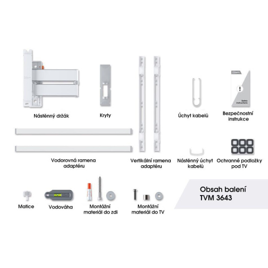 Pro bezpečné naklonění televizoru je nástěnný držák vybaven systémem TiltAnchor™, kterým můžete uzamknout naklánění TV. Měkké podložky na nástěnném držáku chrání zadní stranu televizoru před poškrábáním během jeho montáže. TVM 3643 se snadno instaluje. Součástí balení je vrtací šablona, šrouby, hmoždinky Fischer® DuoPower, stahovací pásky na kabely a vodováha. Jednoduše si vyznačte první vrtací otvor pomocí naší bezplatné aplikace DrillRight™ AR. Je váš televizor mírně nakřivo? Žádný problém. Můžete jej snadno vyrovnat, a to i po instalaci.