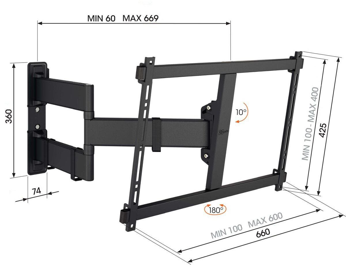 S tímto stylovým nástěnným držákem řady COMFORT Full-Motion+ si můžete sledování svého velkého televizoru maximálně užít. TV 3843 se může otáčet až o 180° a naklánět až o 10° pro optimální pohodlí při sledování. Je navržen pro intenzivní používání, takže je ideální pro rodiny s dětmi. Váš televizor bude zaručeně bezpečně a spolehlivě upevněn. Držák je vhodný pro televizory s úhlopříčkou 50 až 100 palců a hmotností do 55 kg.