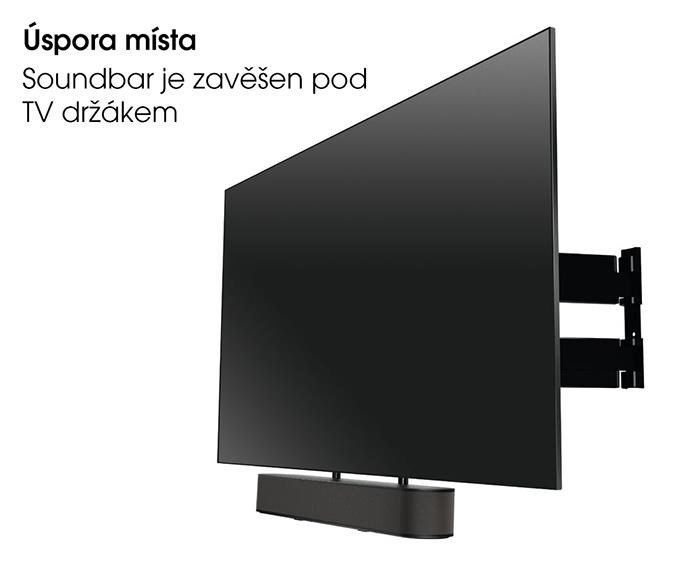 Lze namontovat prakticky na jakýkoliv TV držák. Při natáčení TV se stejně natáčí i soundbar, takže vždy budete mít ten nejlepší obraz bez degradace zvuku.
